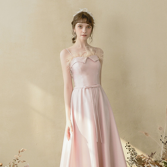 캐미솔라인이 어깨라인을 돋보이게 해 주며 깃털 장식이 유니크함을 더해줍니다.